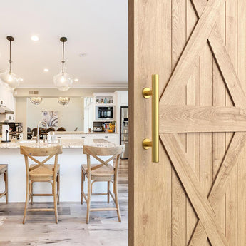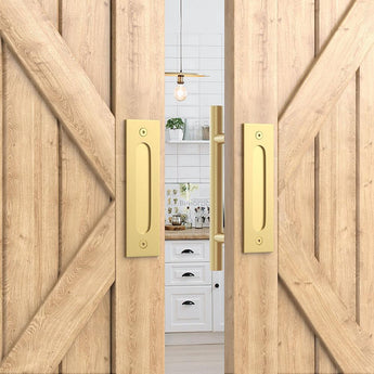 - This Brushed Gold Barn Door Handle with Flush Door Pull looks amazing in the home when partnered with a Rustic or Modern style Barn door.